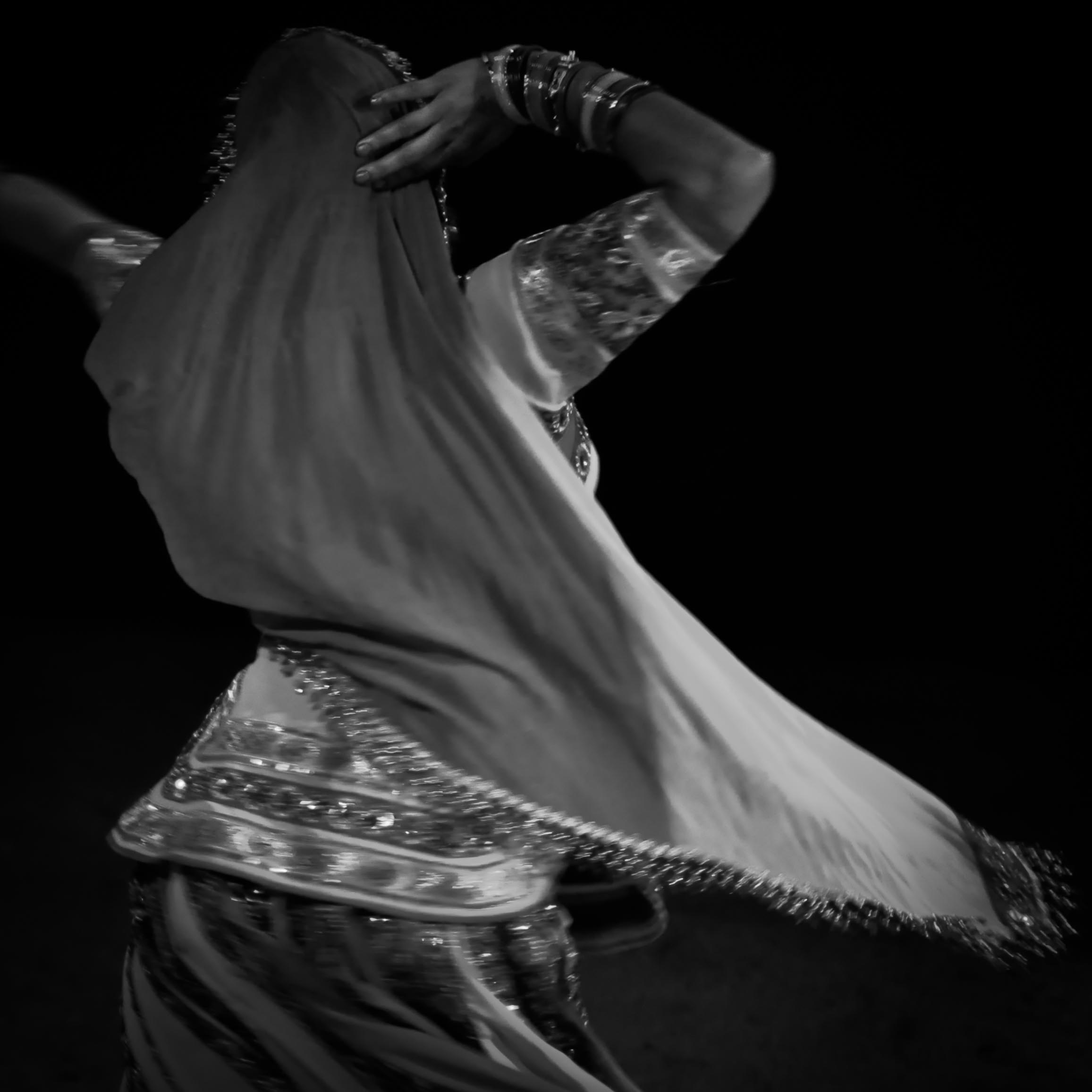 Et doucement vire la hanche, danse son éclair de lumière, et tournoie le vertige des étoffes, ondule la vague de lumière, et tracent leur envol les ailes de la nuit